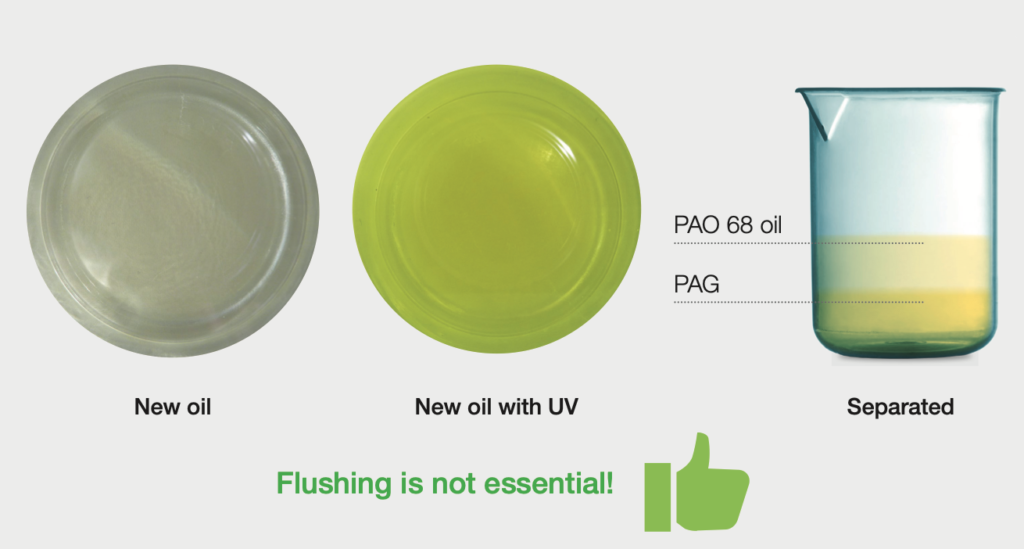 Flushing completely removes the old compressor oil from the system (compressors, filter-driers, expansion valves, and multi-flow condensers cannot be flushed). When refilling afterward, the new compressor is filled with the entire quantity of oil.